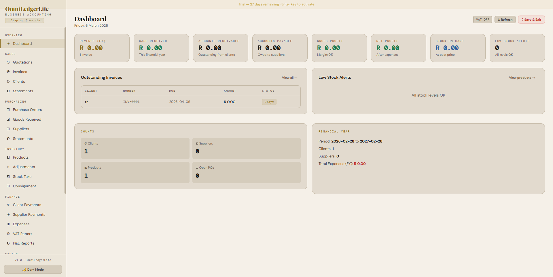 OmniLedger Lite gives small businesses everything in OmniLedger Mini plus a complete stock management system. If your business buys and sells physical goods, Lite keeps your inventory accurate, your invoices pulling from live stock, and your cost values always up to date.